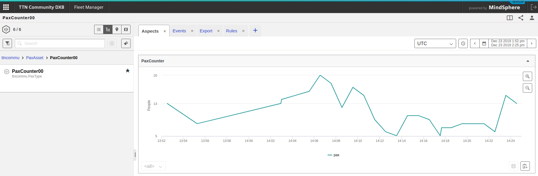 The hard part is done and now it is time to analyze the data on the platform. Login to your MindSphere account, go to Fleet Manager and select your asset. There are multiple tabs here for Aspects, Events, Rules etc. In the Aspects tab you could see your data with a simple graph.