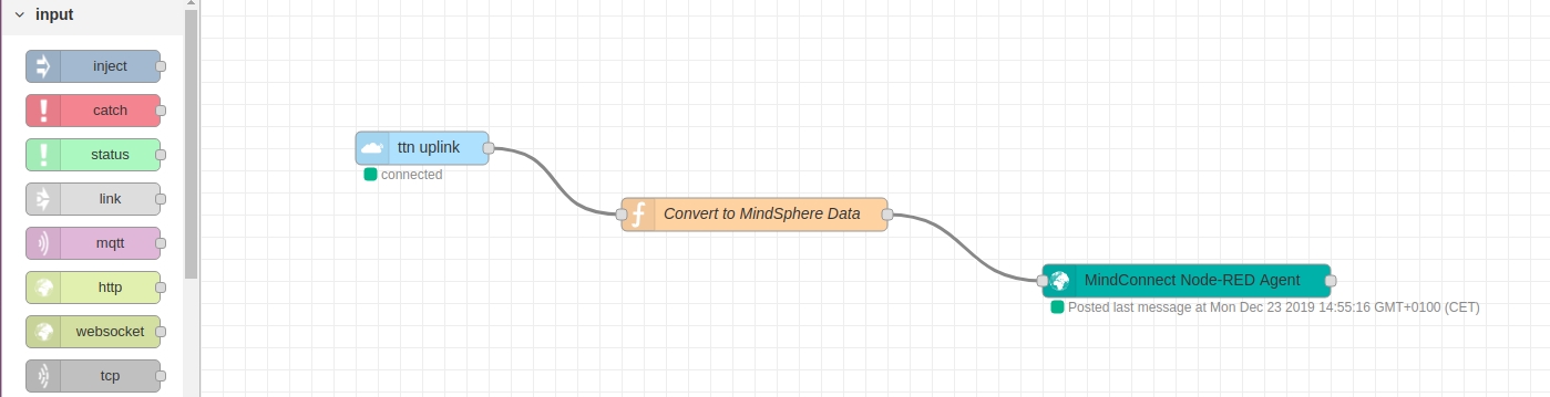 As I mentioned before, we need to build a gateway server between TTN and the MindSphere. The server will use MIndConnect APIs to interact and connect with the platform. These APIs are available as nodejs library. A node is also available for Node-RED users. You could choose to develop the server by either way. As we all know with Node-RED is quite faster and easier.