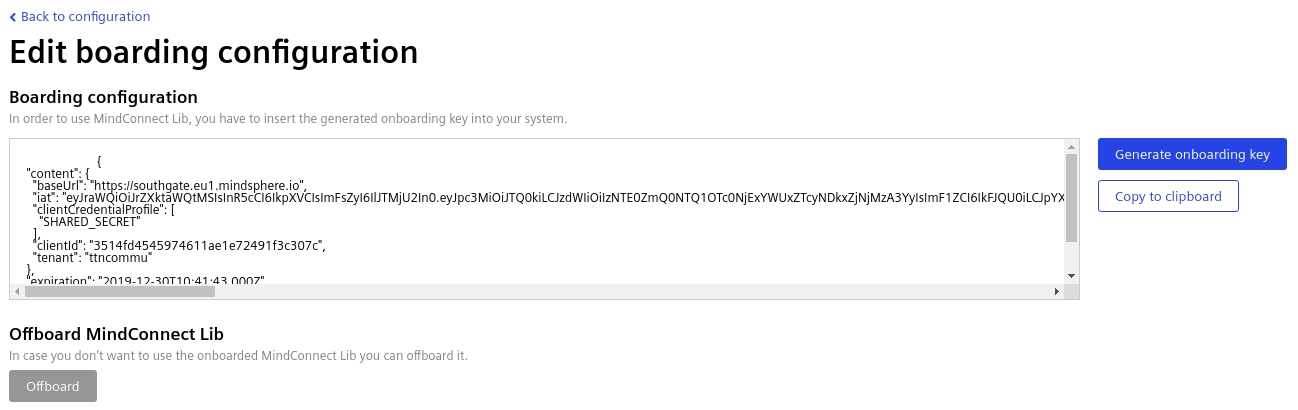 Now, go to Assets and select your asset. Click on Add child asset and select your custom type in the next screen. Complete the step with name and description. At this point, you have the basic framework of your asset. The next step is to add data model for the asset.To do that select your asset and go to MindConnect Lib plugin. When you enter here for the first time it asks for security profile. For simplicity select SHARED_SECRET and in the next screen Generate onboarding key. For now, copy the key and click on back to configuration.