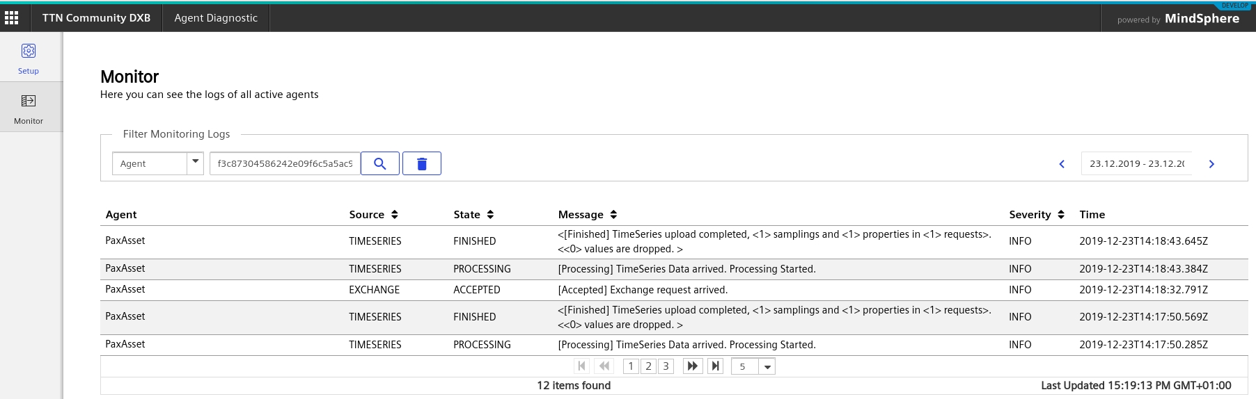 The MindSphere also provides facility to check logs. For that go to the dashboard and select Agent Diagnostic. Here, in Setup section you could create and activate your agent. In the Monitor section you could see the logs for selected agent. These logs could help in debugging if there is mismatch between data sent and data models.