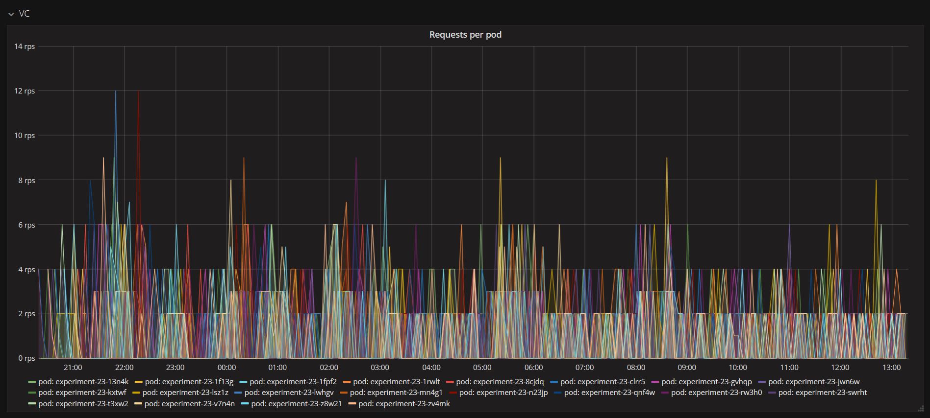 The above graph shows the number of requests made per second per pod to the Version Controller. These different pods represent multiple virtual edge devices running as threads. The Version Controller handled all the incoming requests without fail. Below figure displays all the successful requests handled and served by the Version Controller. This demonstrates the high-availability of the server during high traffic of incoming requests. The cluster is highly scalable.