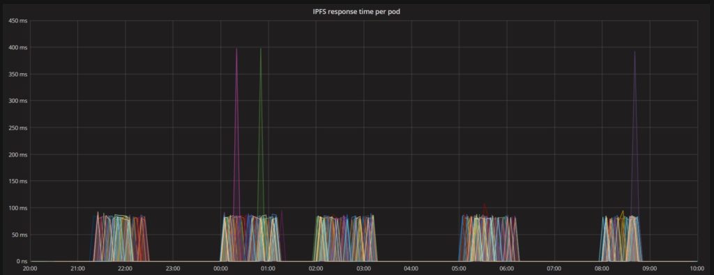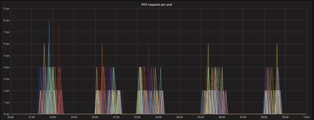 We’ve used different colours in the graph to represent distinct Kubernetes pods. Each pod ran several threads, each representing a virtual IoT edge device that periodically issued polls for updates scheduled in the asvin platform. The IoT edge device securely downloads the new firmware from the IPFS server using its corresponding CID as fetched from the Blockchain server. The graph below shows the number of requests made per second, per pod to the IPFS server. The IPFS server function was faultless while handling the soaring requests from thousands of devices.